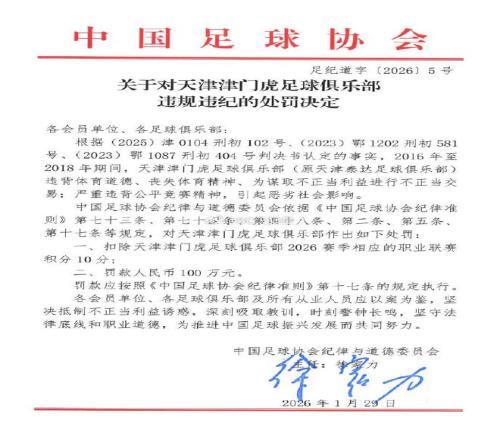 周四,中国足协正式公布受处罚俱乐部名单。天津津门虎被罚10分,王栋、邓小飞则遭到终身禁足。